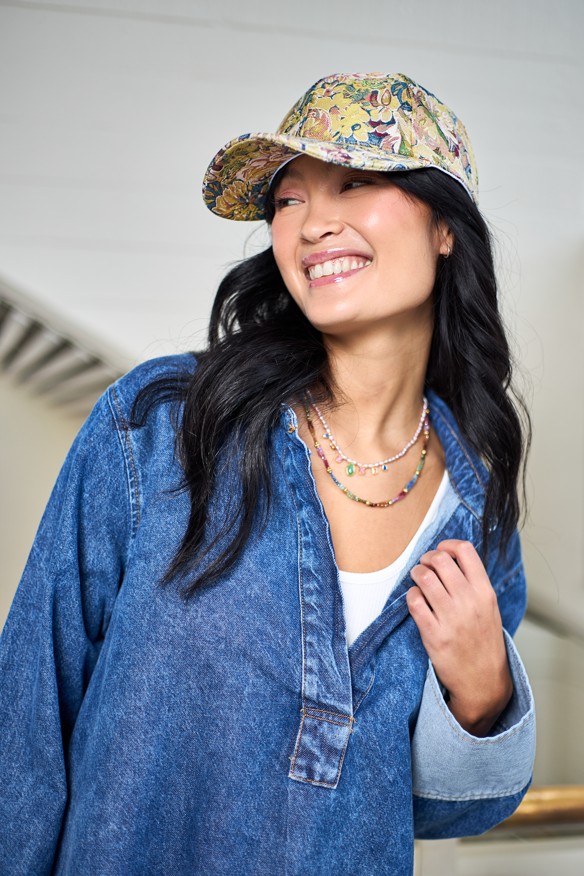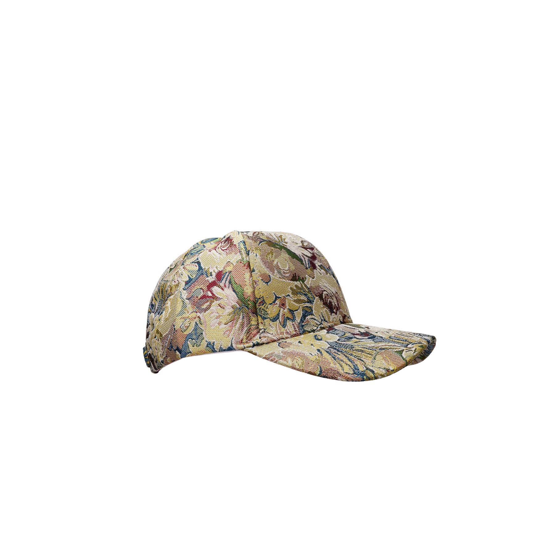 DUNE Cap fra Black Colour. med et blomstret mønster i flere farver. Kasketten har gul som grundtone med blå og røde blomster.