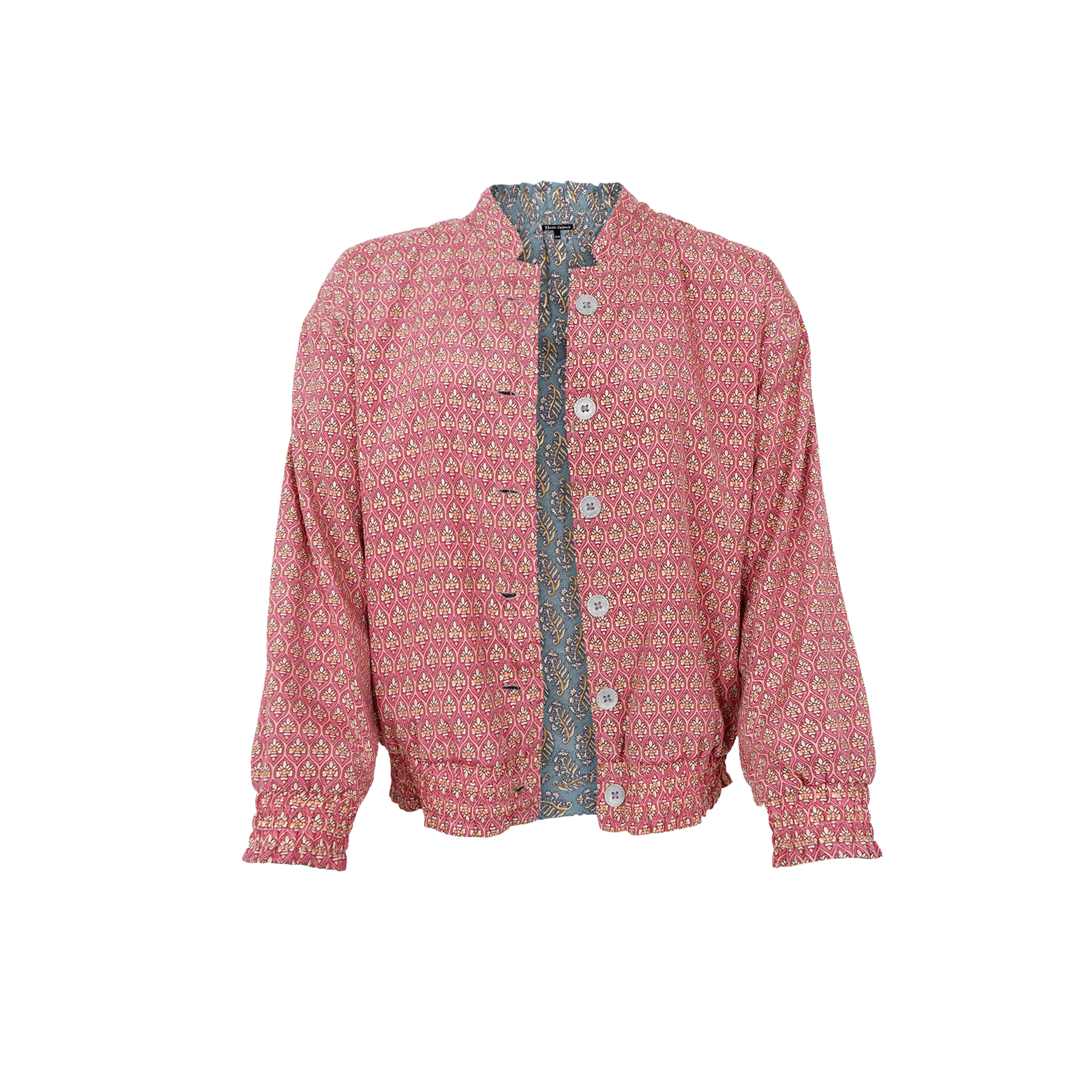 Jakken har lille stående krave, knaplukning og elastik ved både håndled og kant, hvilket giver en behagelig og let afslappet pasform.