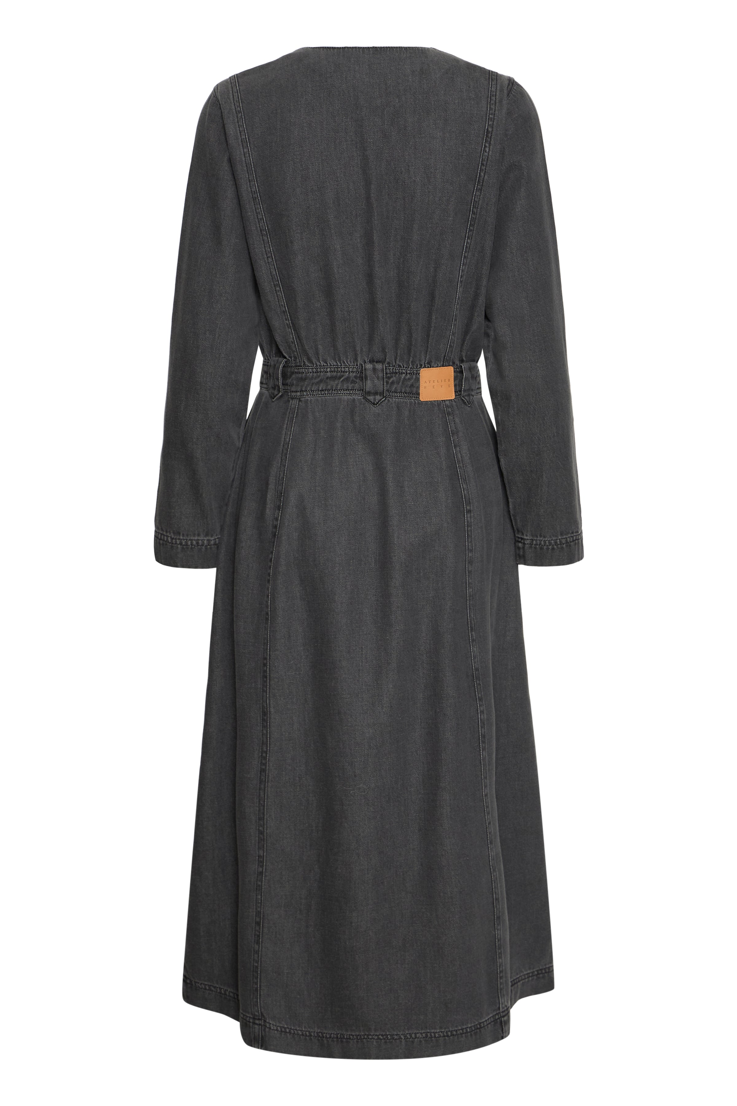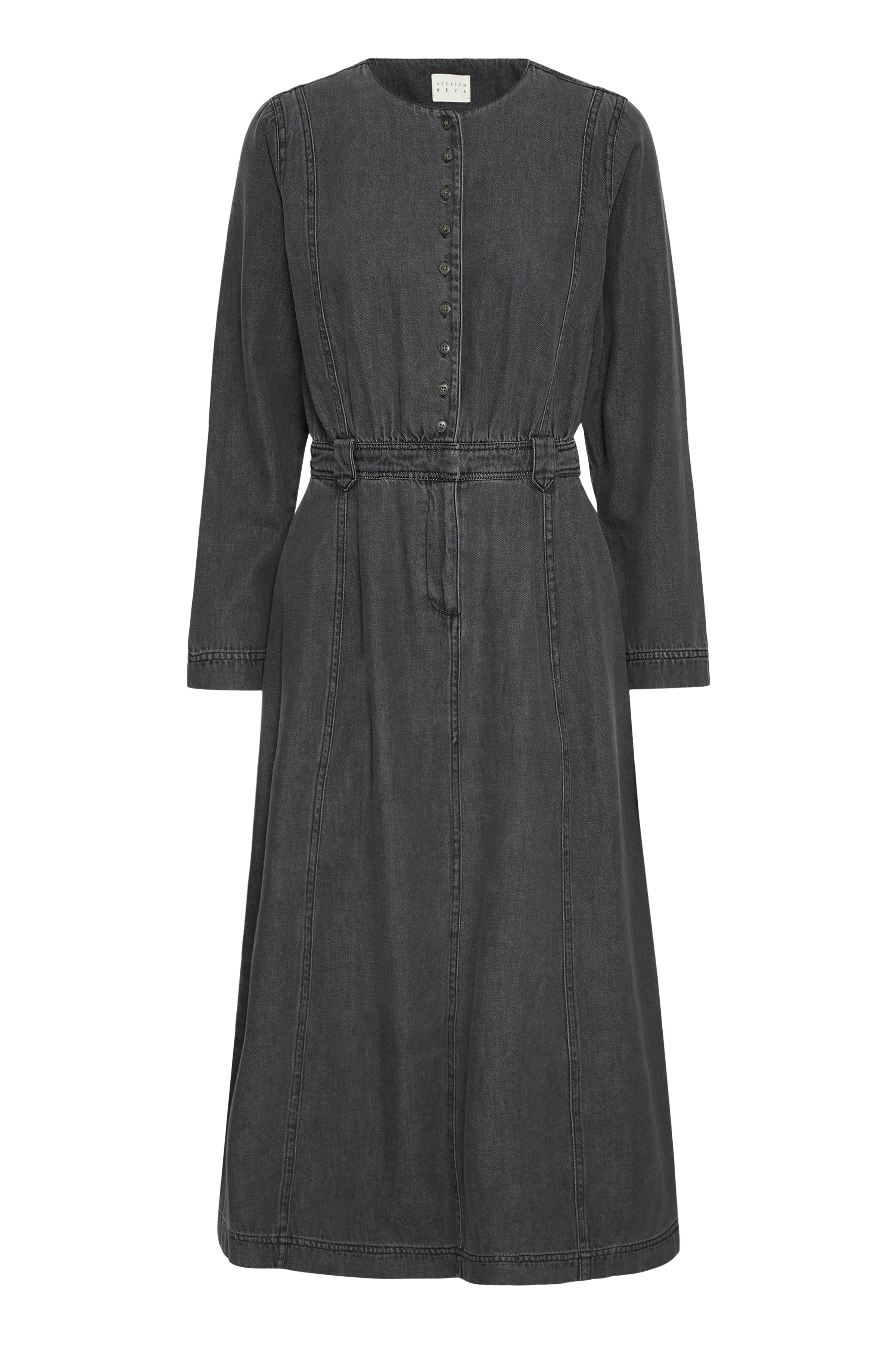 IRJULIETTA denim kjole fra Atelier Rêve - er en kjole med flotte detaljer. Den er knappet ned gennem overdelen, har rund hals, fast linning med bæltestropper og lommer.