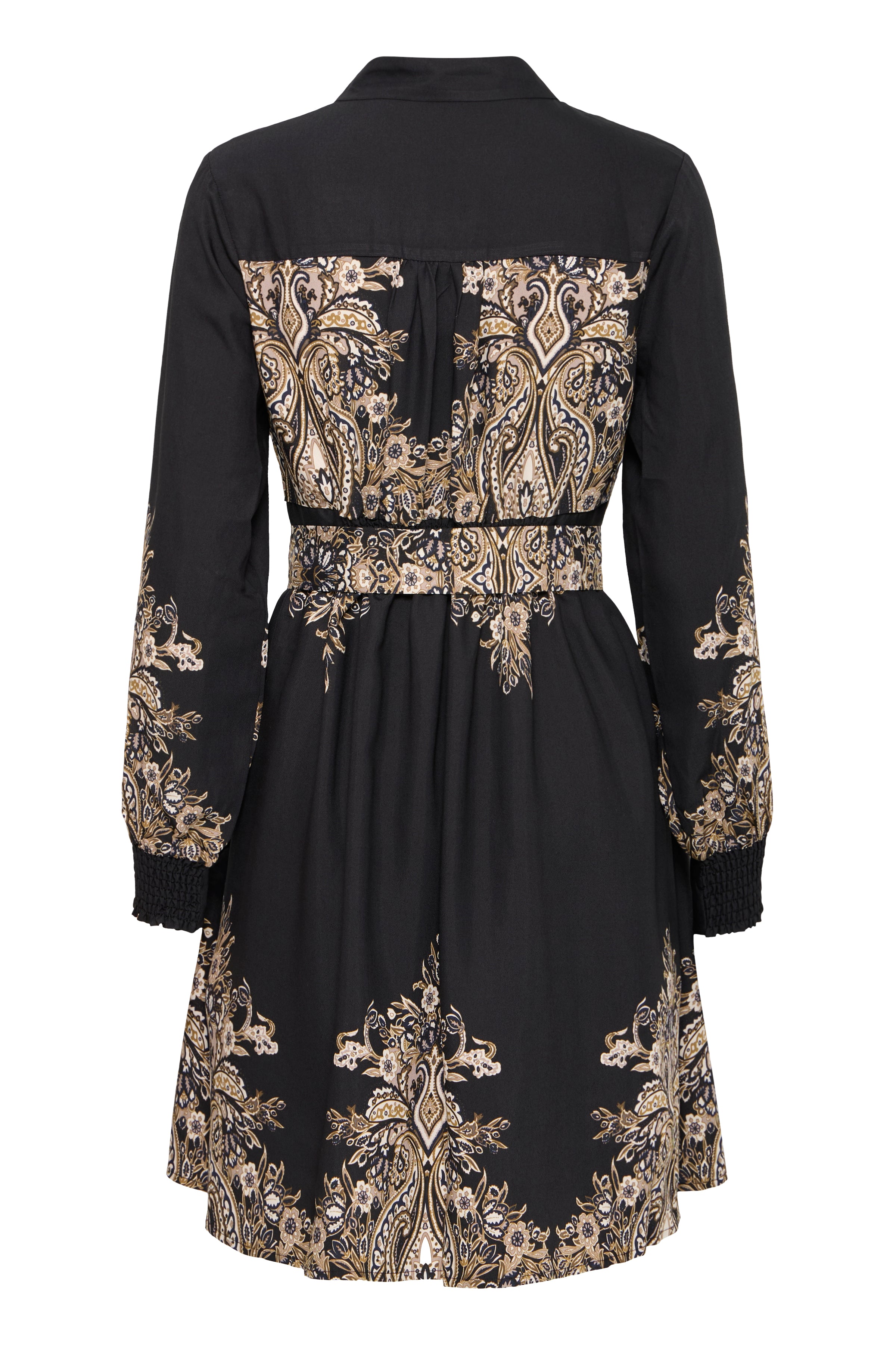 FRADARA DR 1 kjole fra FRANSA er designet i et elegant sort paisley print i gyldne og neutrale toner. Kjolen har lange ærmer med manchet, gennemgående knaplukning og en feminin taljering med elastik i ryggen, der giver en flot pasform og høj komfort. Bindebæltet i taljen fremhæver figuren, mens det lette materiale falder smukt.