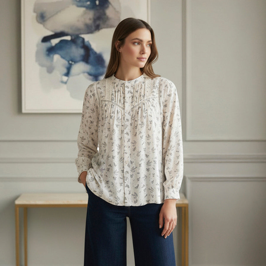 ASIS skjorten fra OFELIA er en feminin bomulds skjortebluse. Skjorten har et fint blomsterprint og fine detaljer ved bærestykket. Den er gennemknappet og har rund hals.