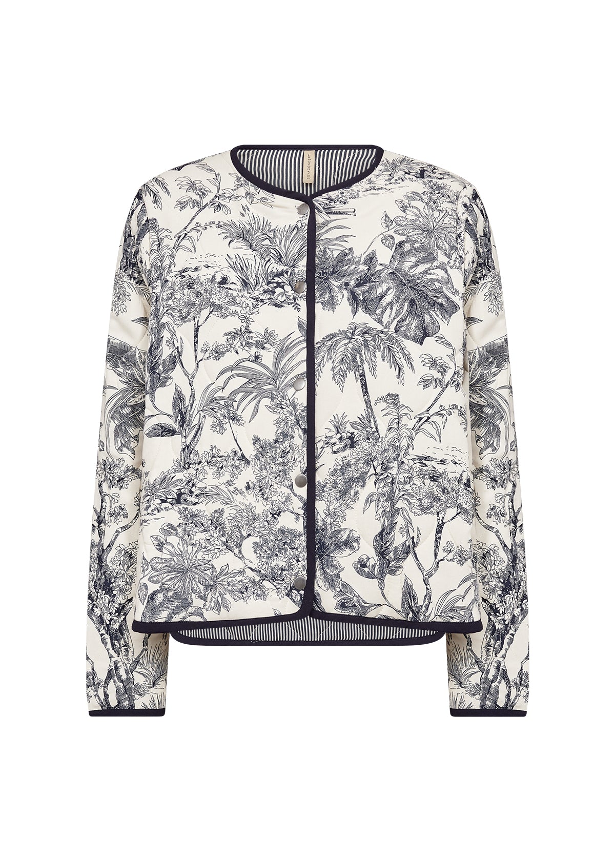 Den har rund halsudskæring, knapper foran og et slående botanisk print med quiltet tekstur og stribet kant.