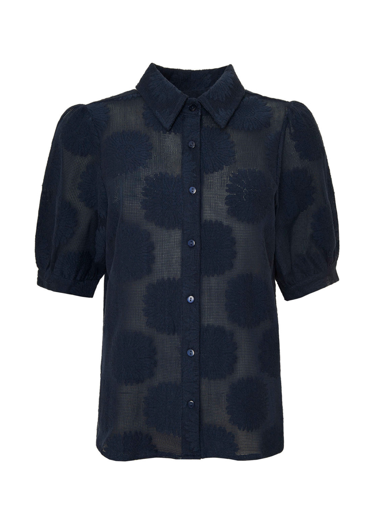 LOLA skjorten fra OFELIA er en feminin bomulds skjorte med 3/4 puff-ærme. Skjorten er tynd organza-agtig, dekoreret med store cirkler. Den er gennemknappet, og har klassisk skjortekrave.