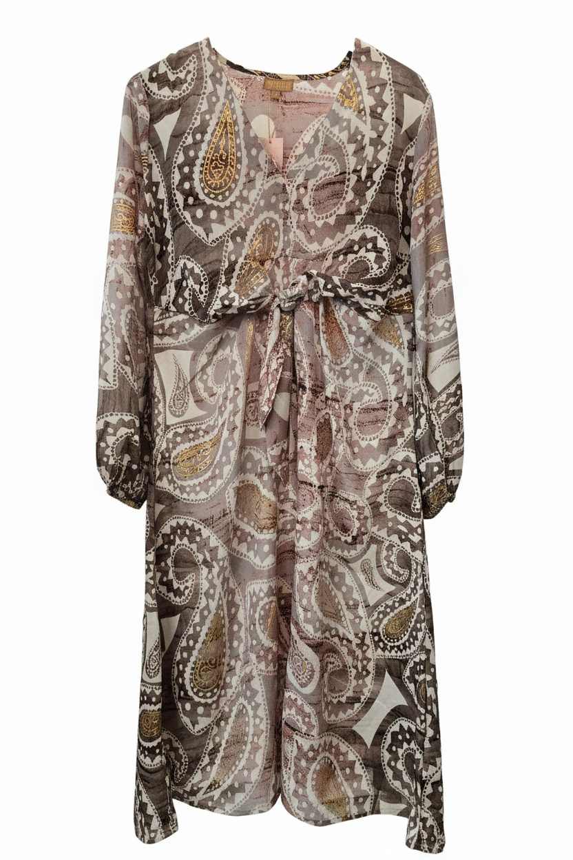 VEGA DRESS fra Wilto. Lækkert print i rosa/guld nuancer. En super smuk kjole med V-udskæring og lækre detaljer som bindebånd i taljen. Passer til både hverdag og en festlig anledning.