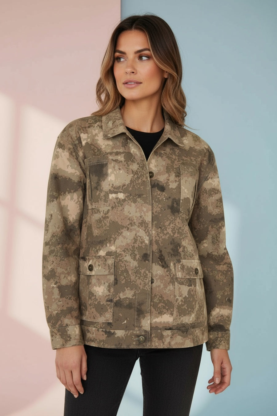 CAMMA jakken fra OFELIA er en cool jakke i camo print. Den har klassisk krave, er gennemknappet og skjult bindebånd i taljen.