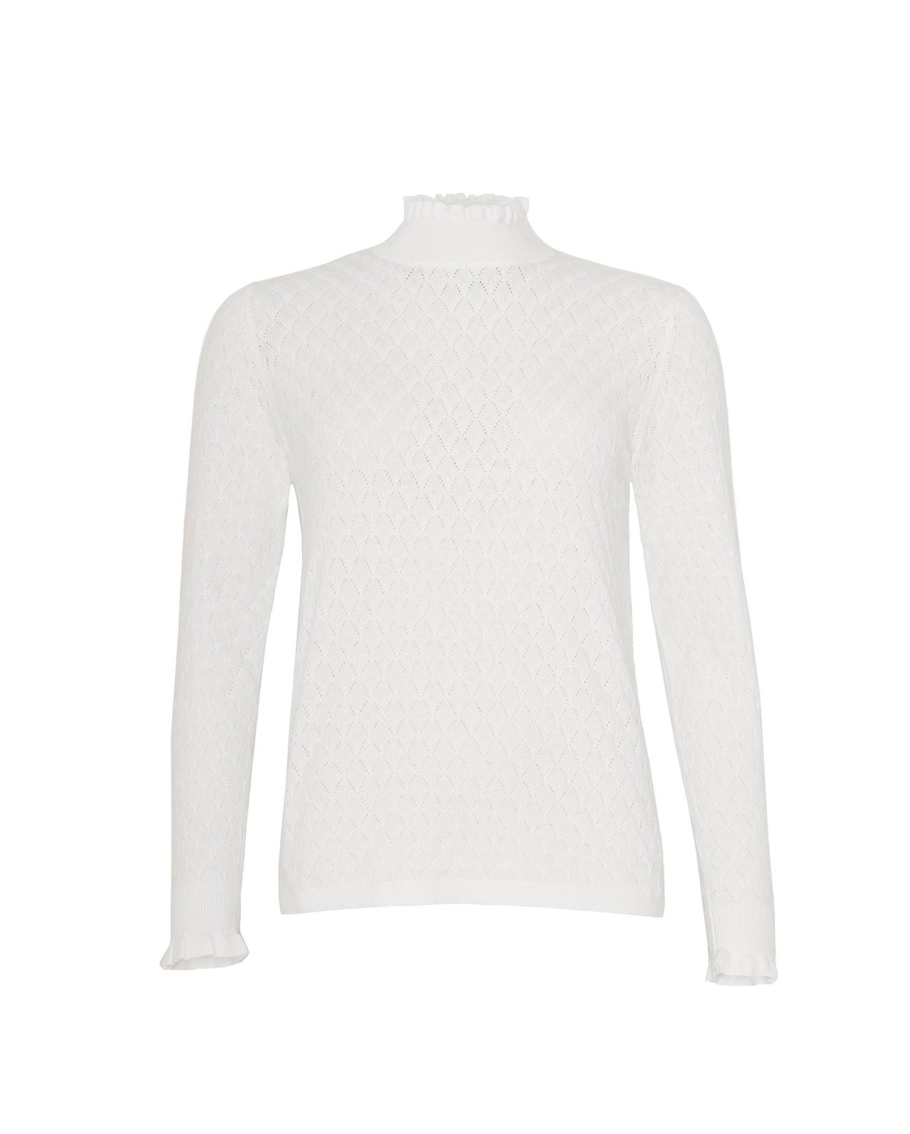 AJA pullover fra OFELIA er den fineste rundhalsede strik med tulle kanter i kanten forneden og i ærme kanten. Det fine strukturmønster giver et flot spil i denne strikkede bluse.