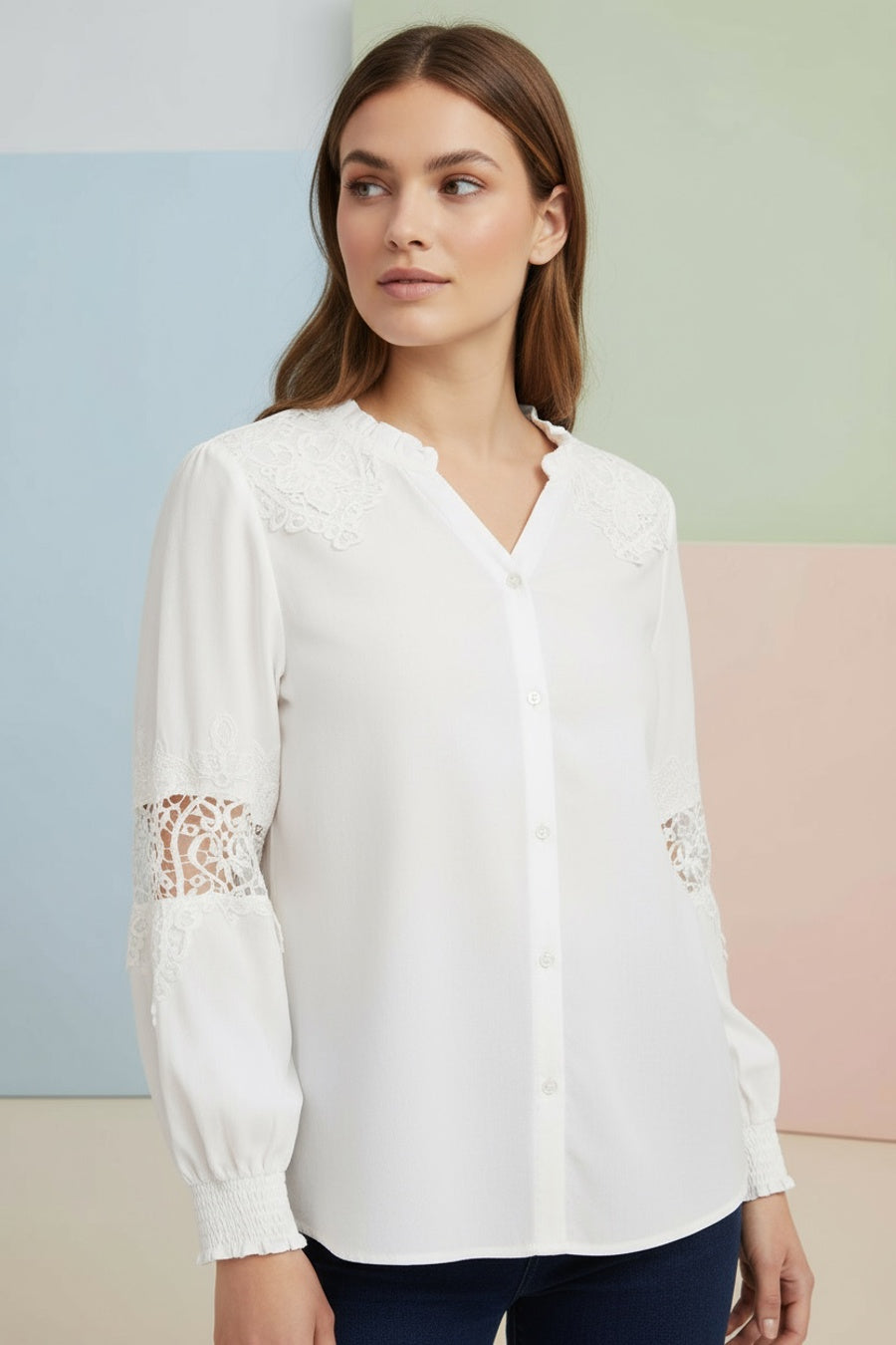 NOVA skjorte fra OFELIA med mange fine detaljer. Rund hals med flæse og v-udskæring, lange ærmer med smock forneden, gennemgående knapper og ikke mindst en flot struktur i stoffet, som skaber et gennemsigtigt stykke på ærmet. På skulderen er påsyet smuk blondebesætning, ligesom ærmet er brudt med samme blonde. Dette giver et feminint og elegant udtryk til skjorten.