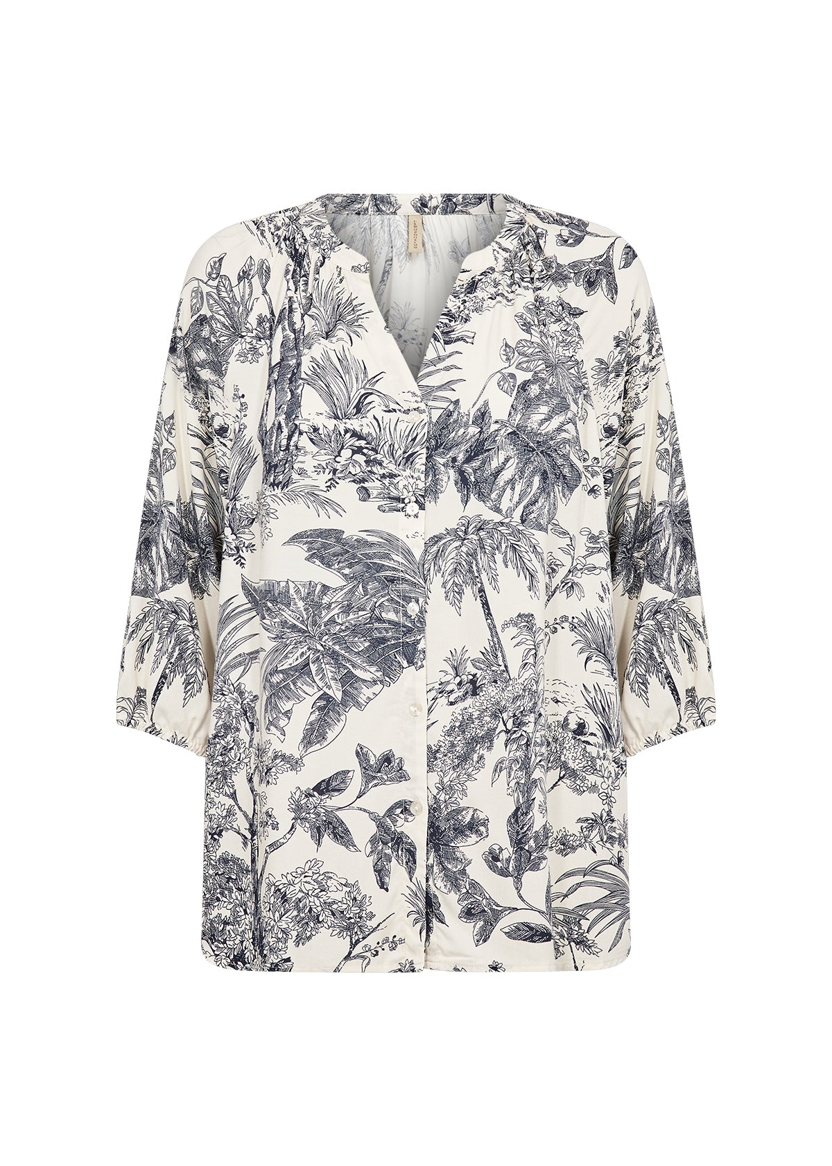 Den har en diskret V-hals, elastiske manchetter og et livligt naturinspireret print, som gør den unik. Sæt den sammen med skræddersyede bukser eller en fin nederdel for et elegant look.
