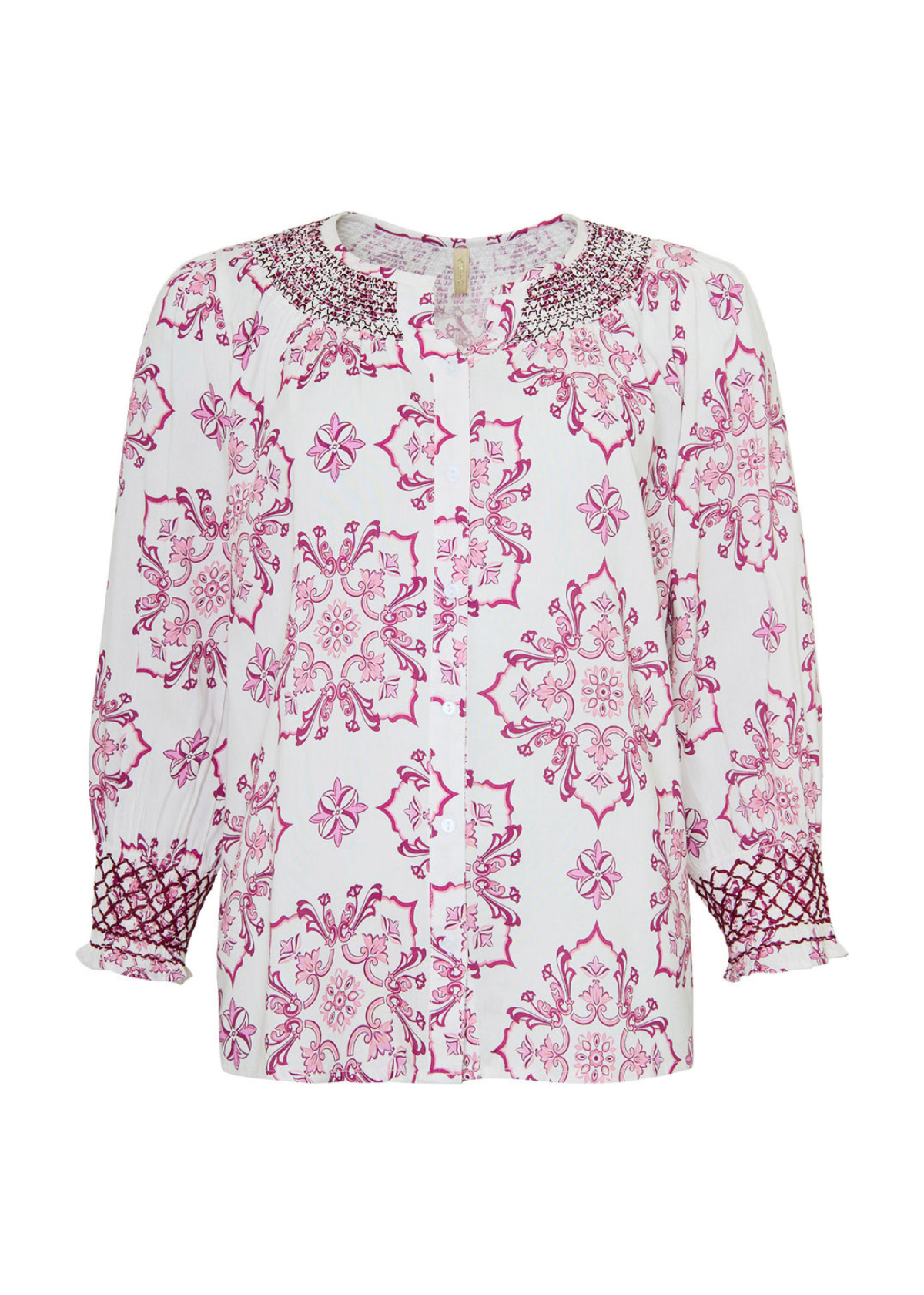 FIE skjorten fra OFELIA er en feminin skjortebluse. Den har et dekorativt print, flotte detaljer ved krave og håndled, samt smock der gør, at ærmet blvier oppe hvis du vælger at trække det lidt op. Den har fin rundet hals, og krapper hele vejen ned.