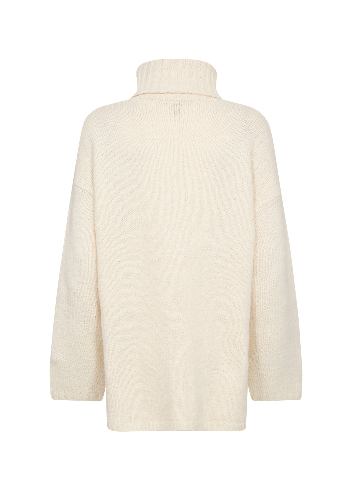 Pulloveren har en stor rullekrave, lange ærmer og en oversized pasform.