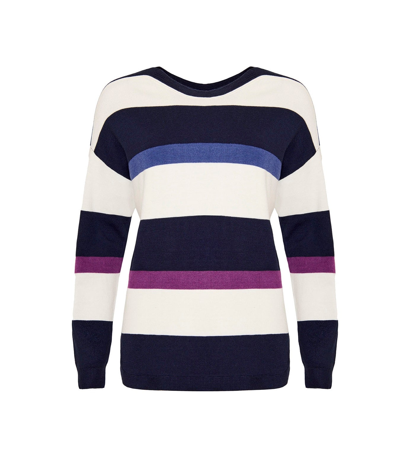 • LULLU STRIK pullover fra OFELIA er i tykke hvide og sorte striber med en tyndere stribe af lilla og blå. Dens farver gør den nem at matche med flere farver. Strikken har en afslappet pasform til eksempelvis et par jeans. Den har lange ærmer og en let åben hals.