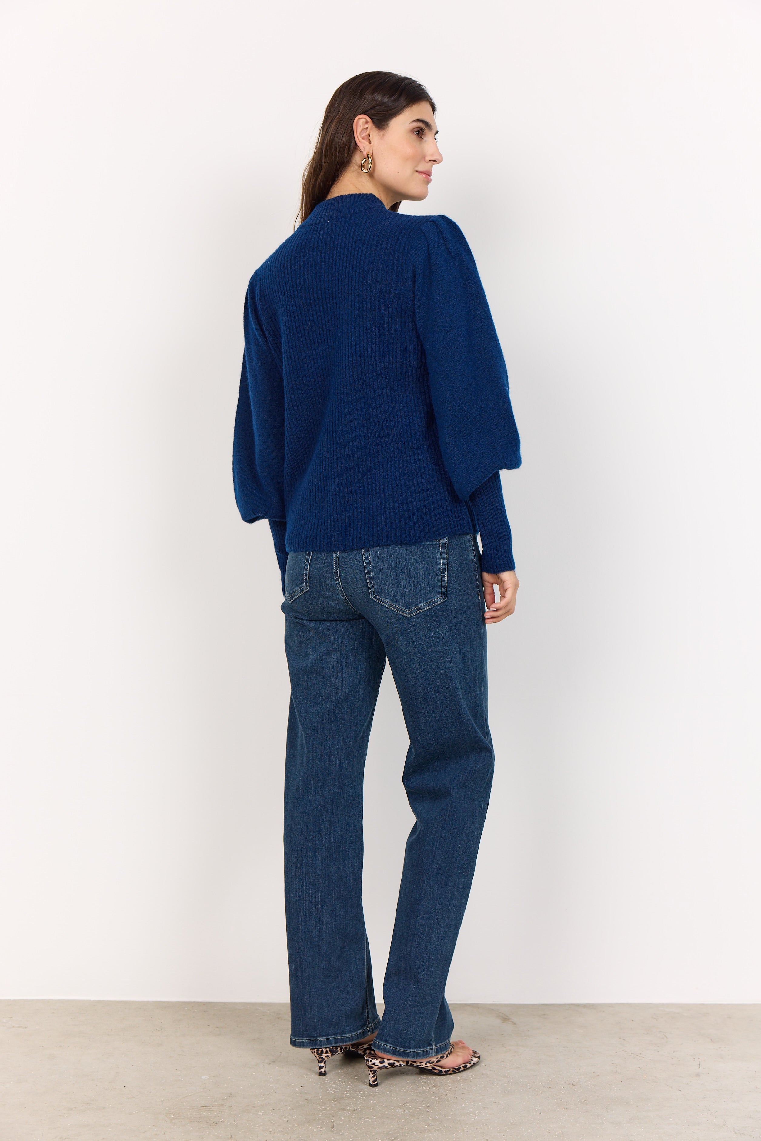 Pulloveren har en høj halsudskæring, lange ballonærmer og en behagelig pasform.