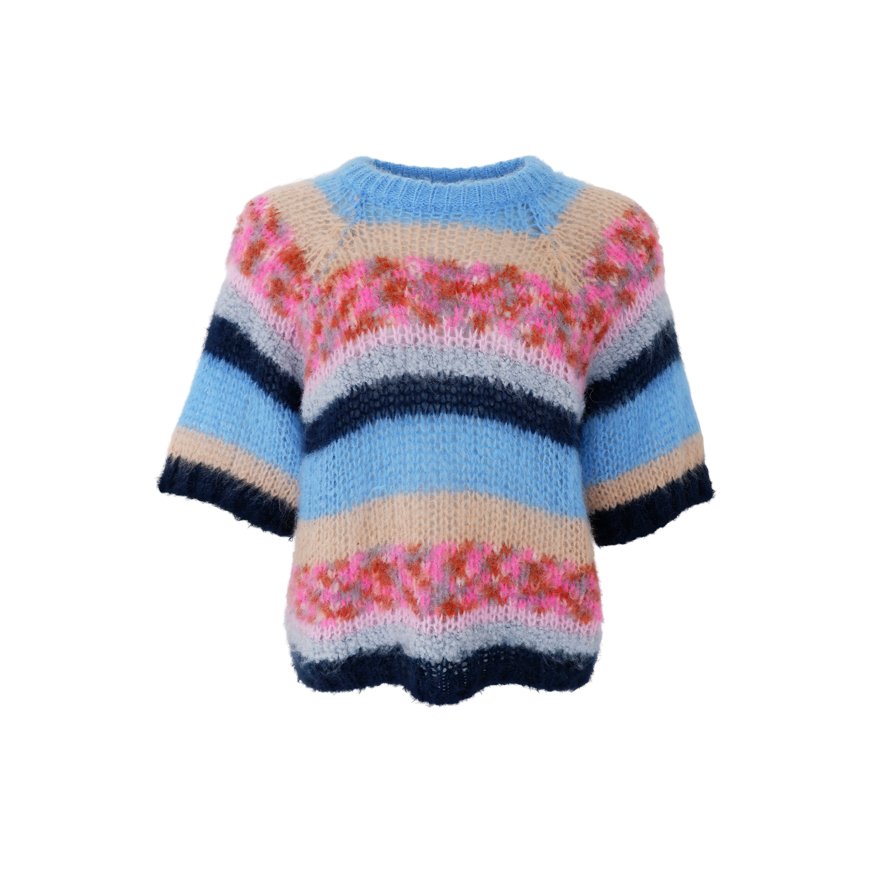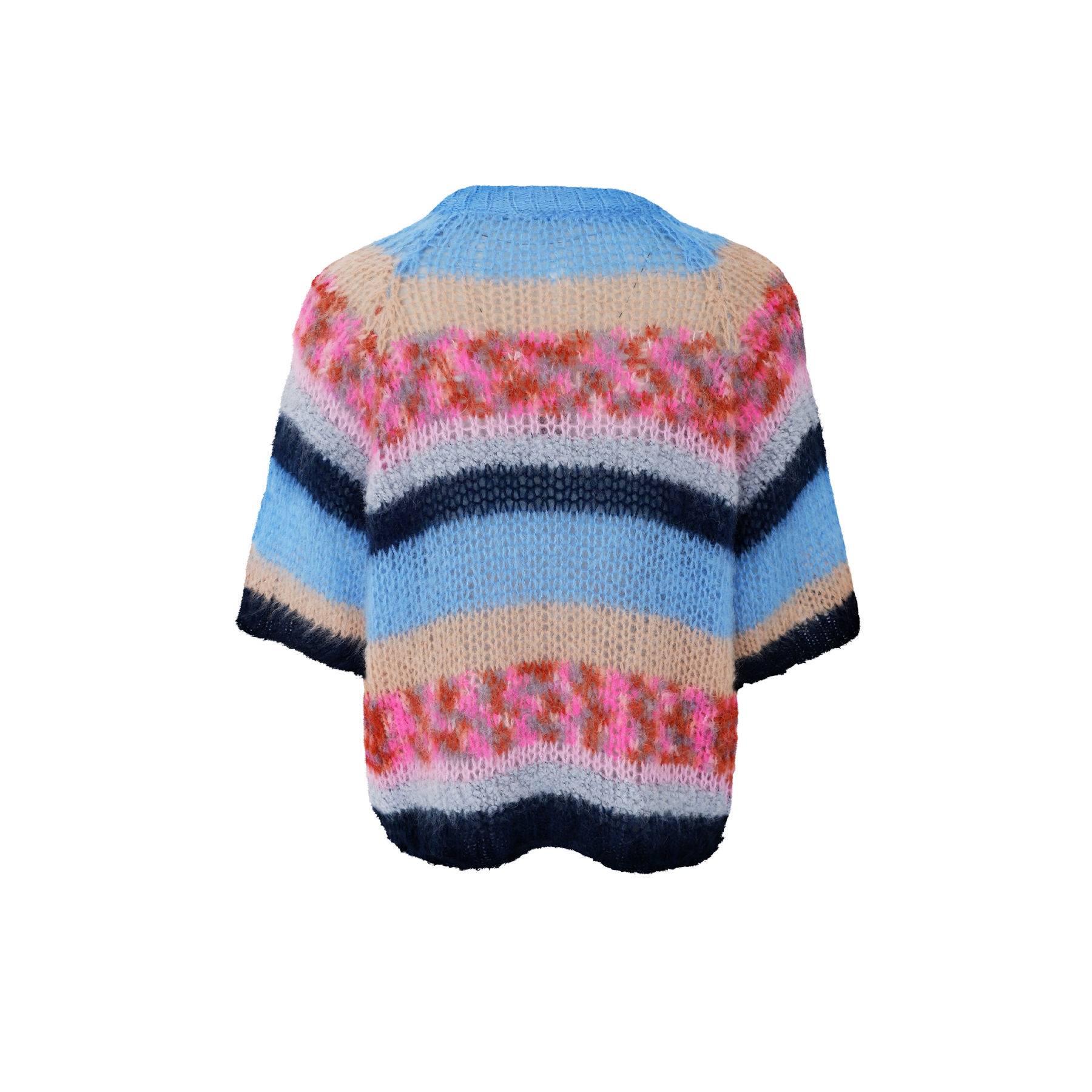 SOPHIE stribet jumper fra Black Colour er udført i en blød og let kvalitet med et smukt, flerfarvet stribemønster, der giver et levende og moderne udtryk. Den har rund hals med ribkant og korte ærmer, som skaber et afslappet look med et feminint twist.