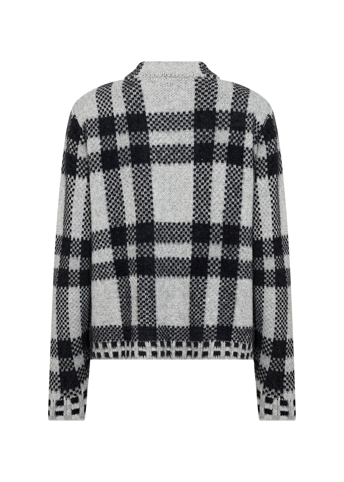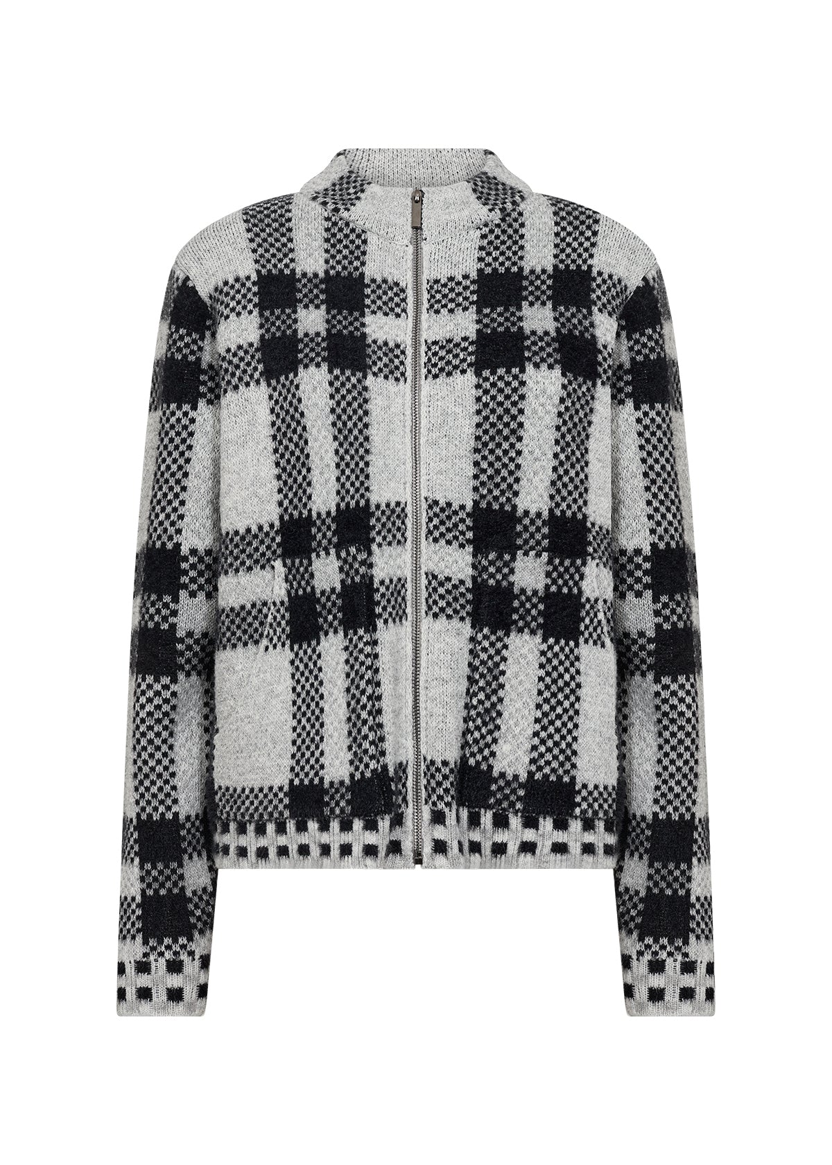 Den har en høj krave, lynlås, et ternet mønster og slutter i hoftelængde. Sæt den sammen med jeans for et afslappet look, eller tag den over en kjole for ekstra varme og stil.