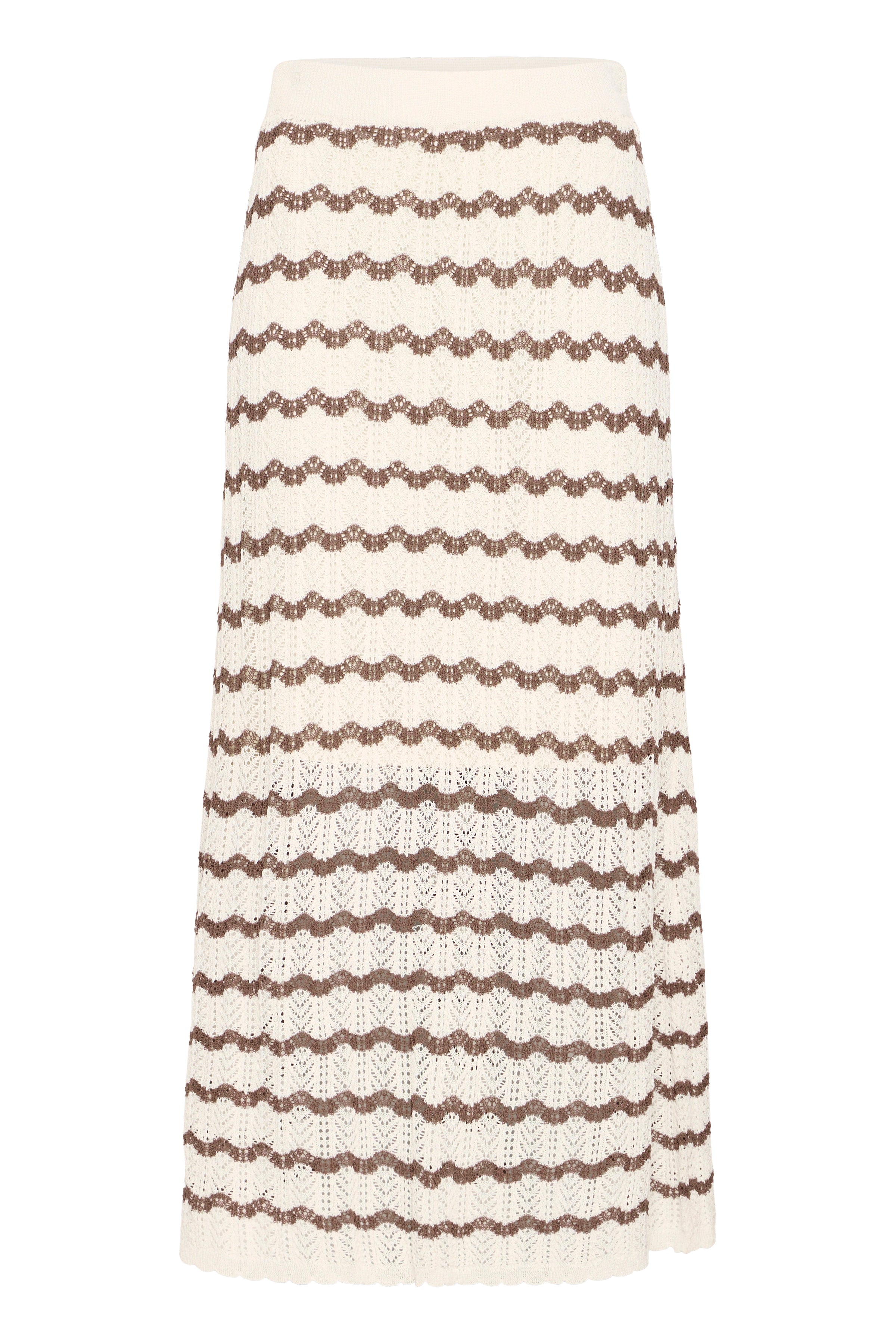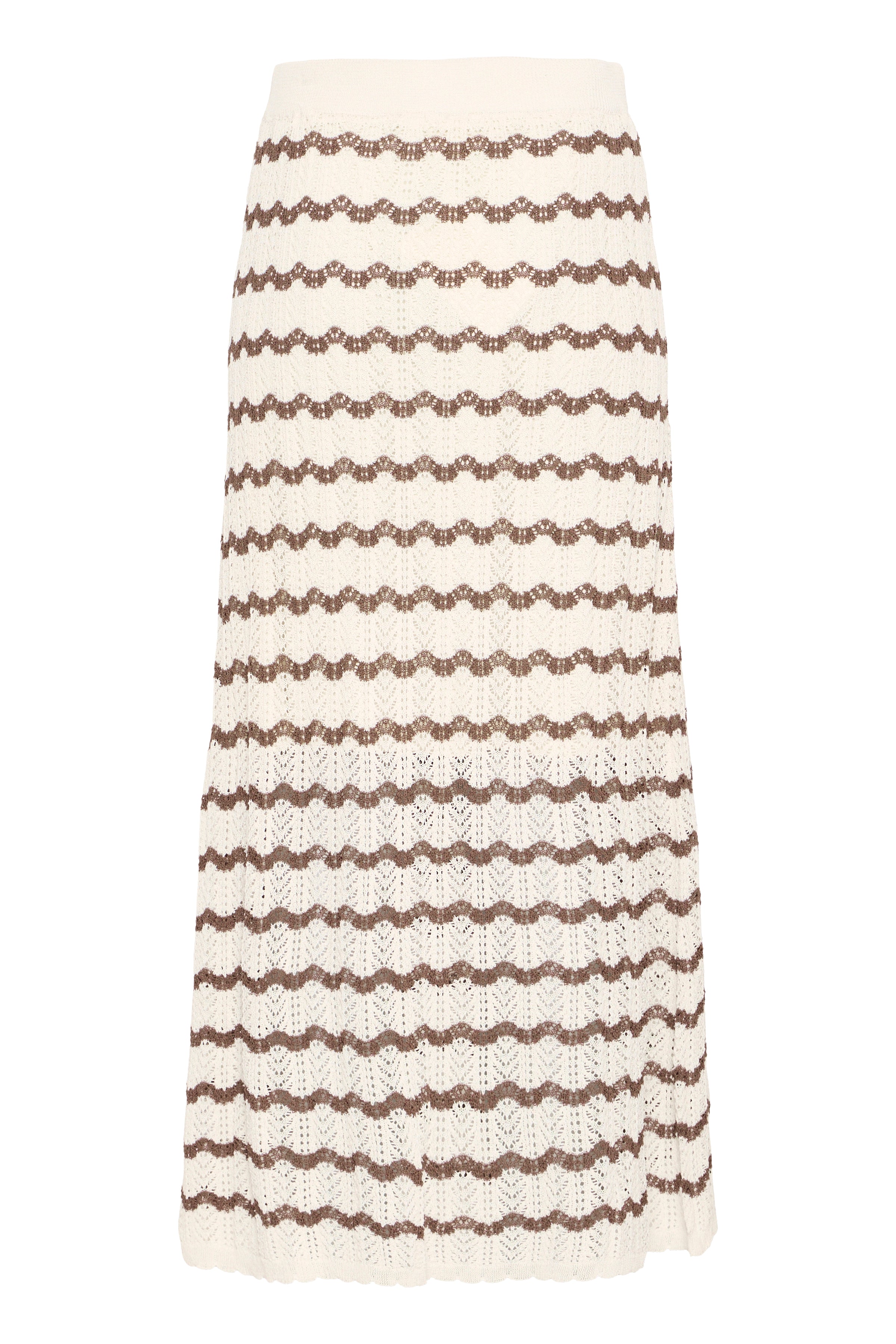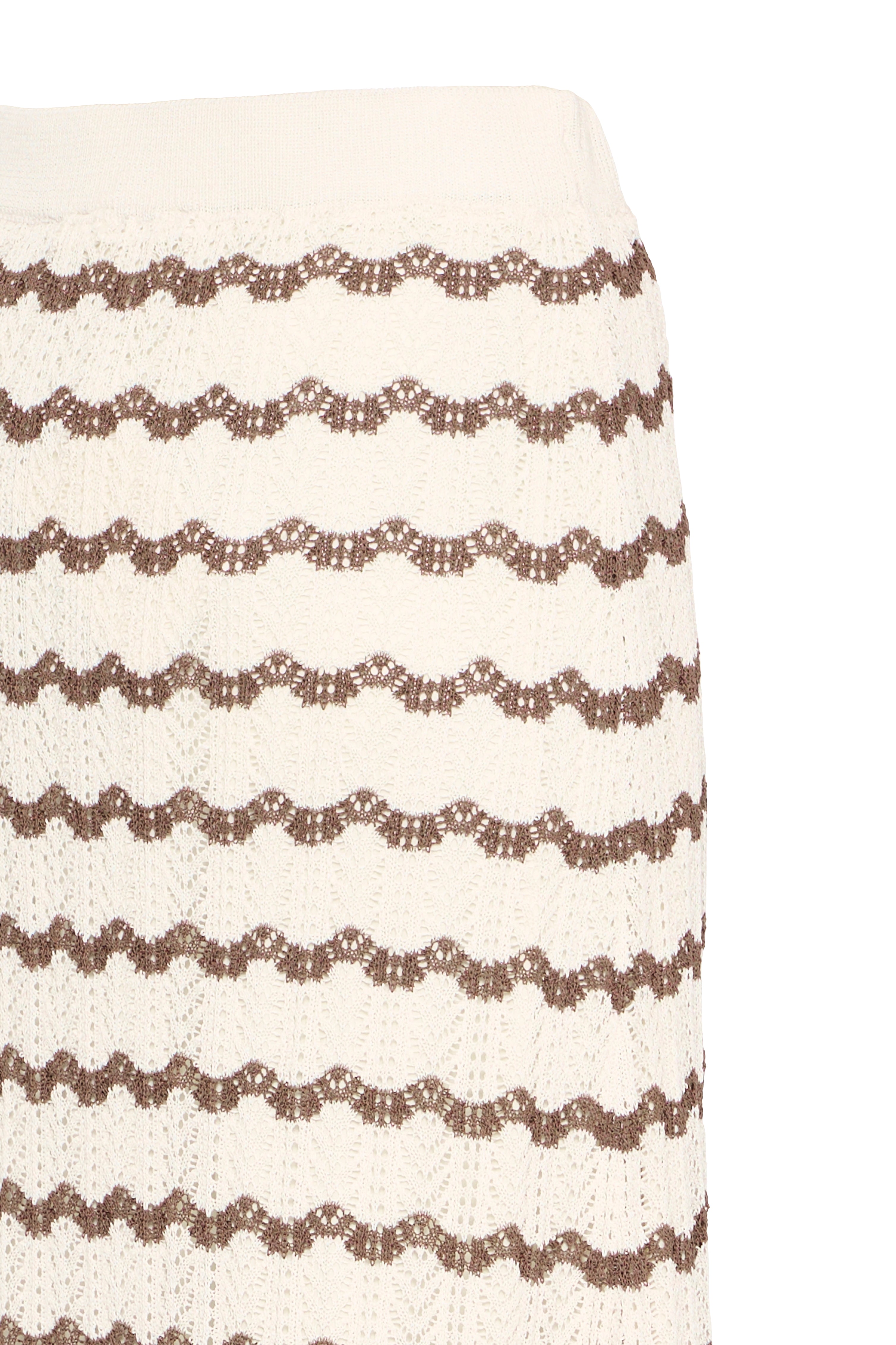 IRSESSIE nederdel fra Atelier Rêve en skøn strikket nederdel med kontraststriber og dekorativt struktur hulmønster. Den er let a-shape, har elastik i taljen og fin tungekant for neden.