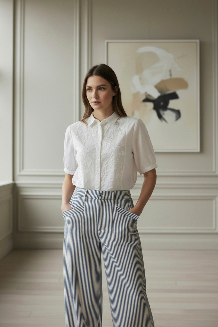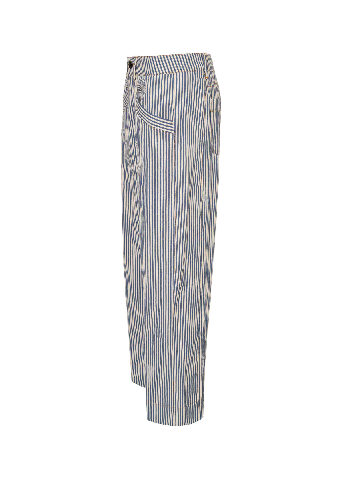 SIKA BUKSER fra OFELIA. En lækker buks i klassisk mælkedrengestrib. Bukserne har brede ben, høj talje med fast linning, og klassisk lukning med lynlås og knap. Der er påsyede skrå-lommer foran, og en lille påsyet lomme bagpå.