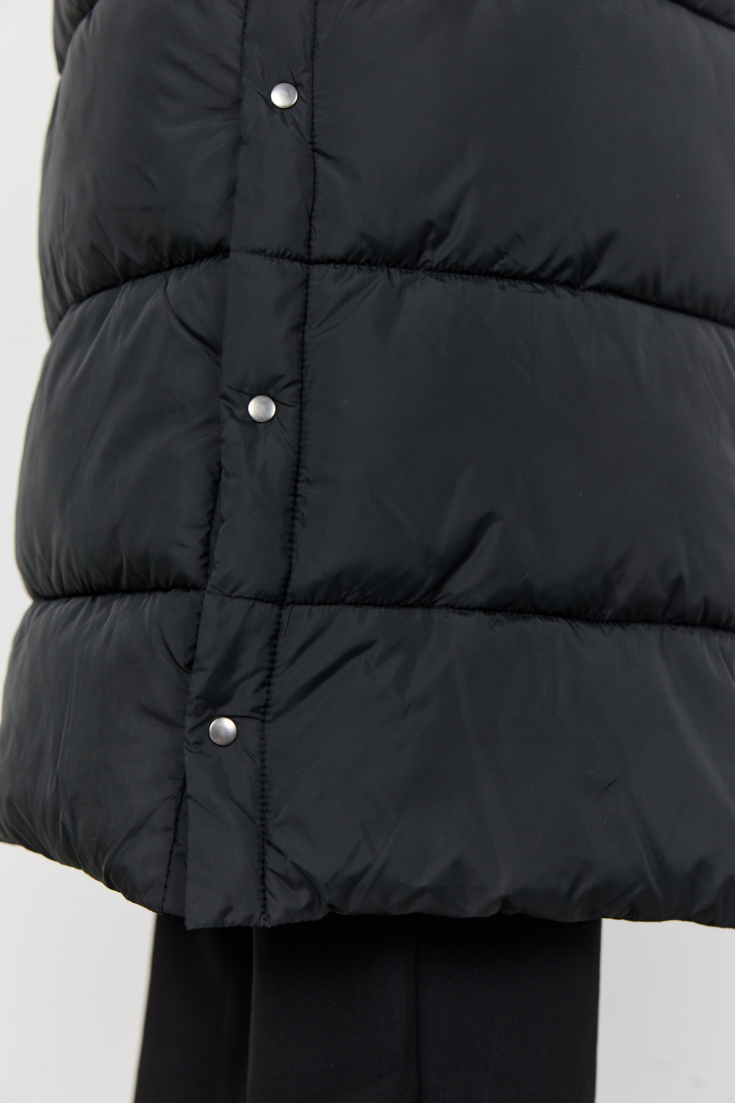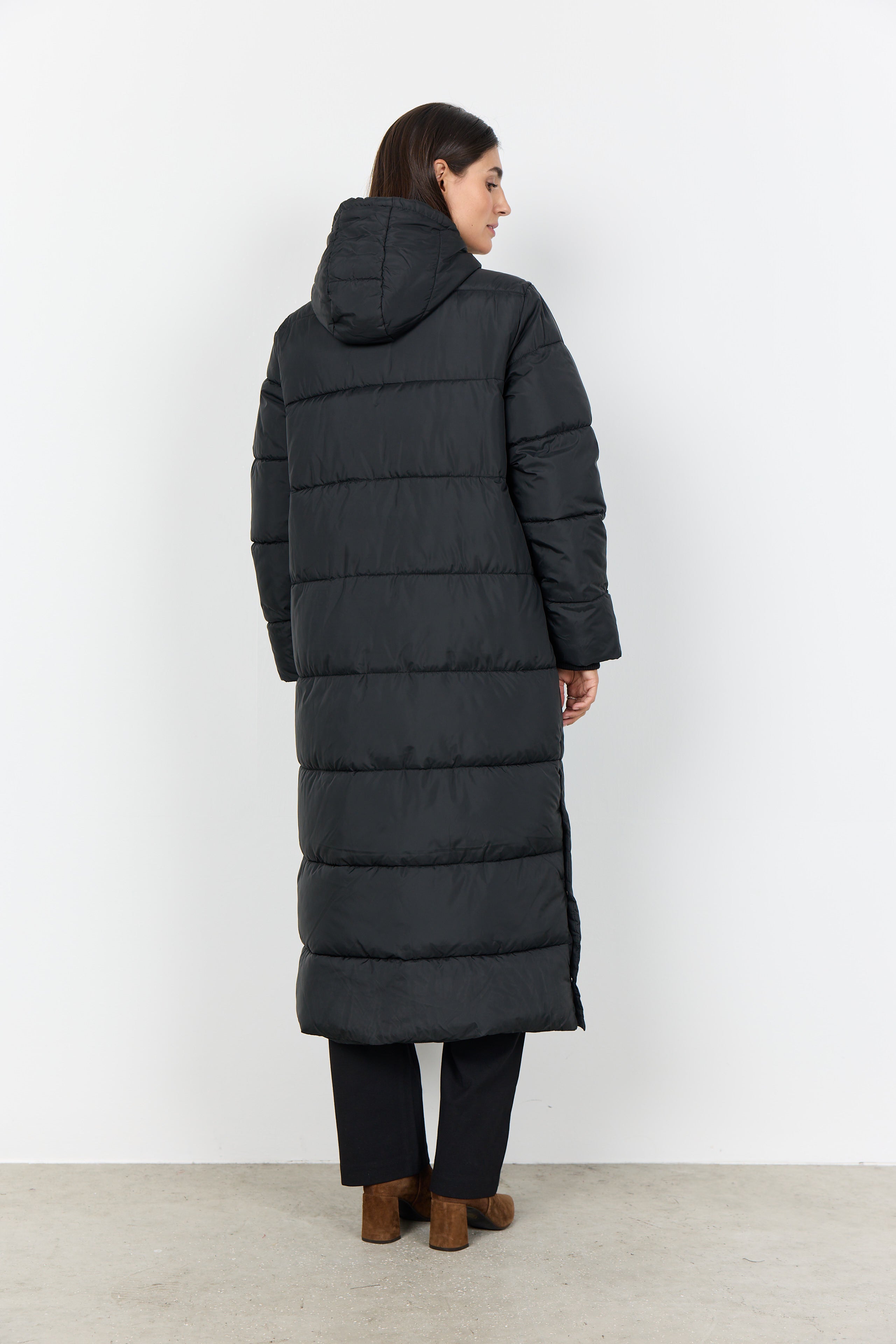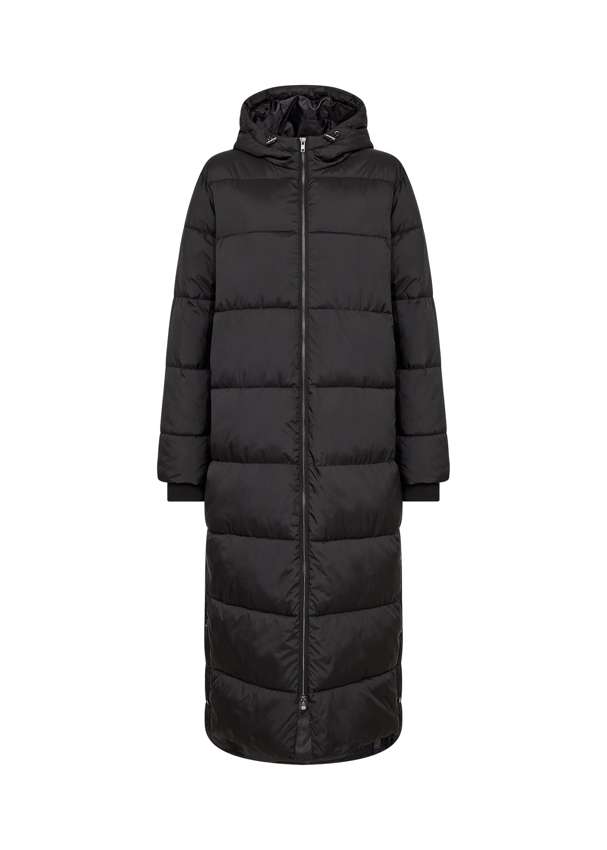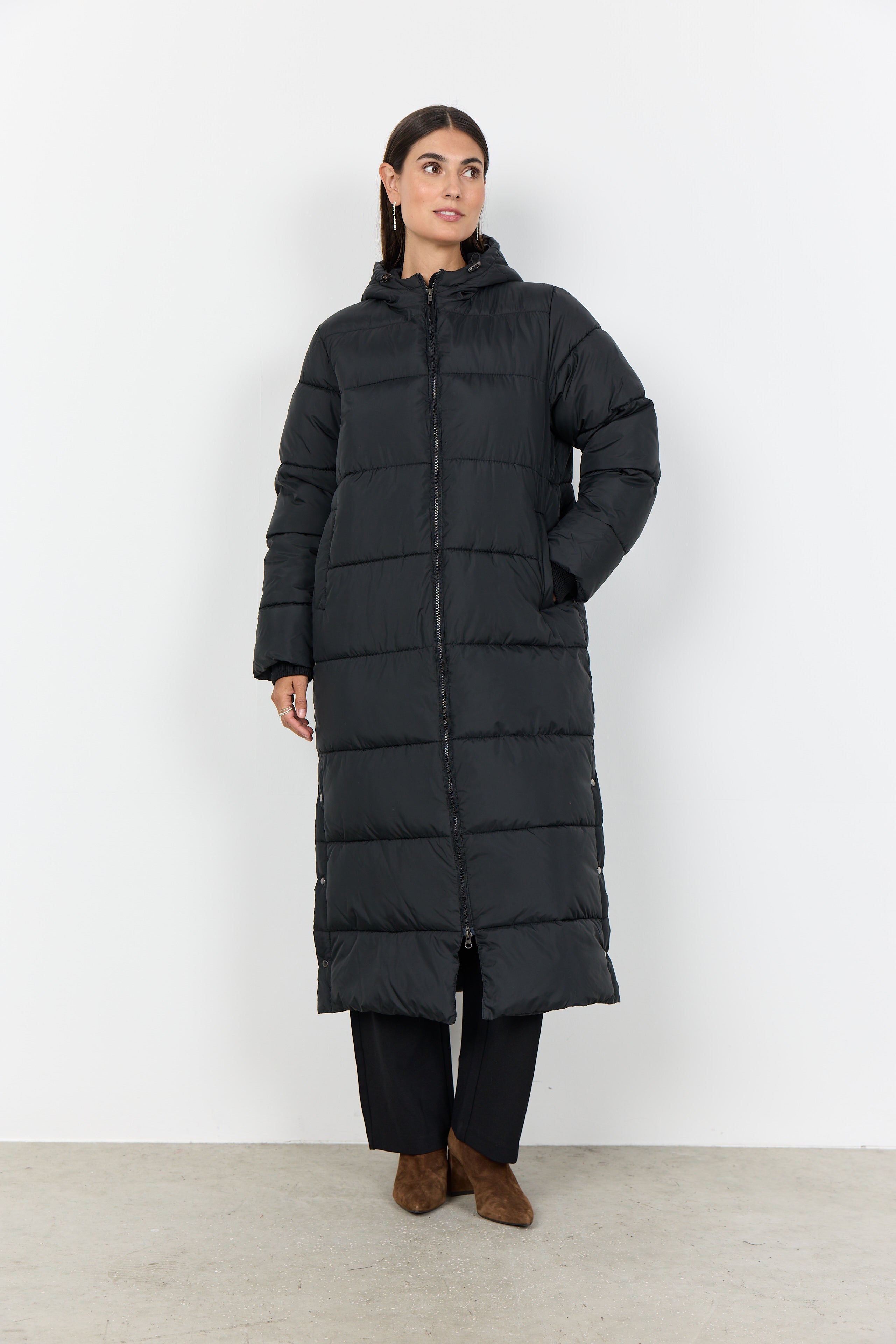 • SC_SORINE 1 frakken fra SOYACONCEPT. Den har en krave med hætte, en lynlås i fuld længde og quiltede syninger, der giver et hyggeligt look. Praktisk åbning med trykknapper for neden i siderne.