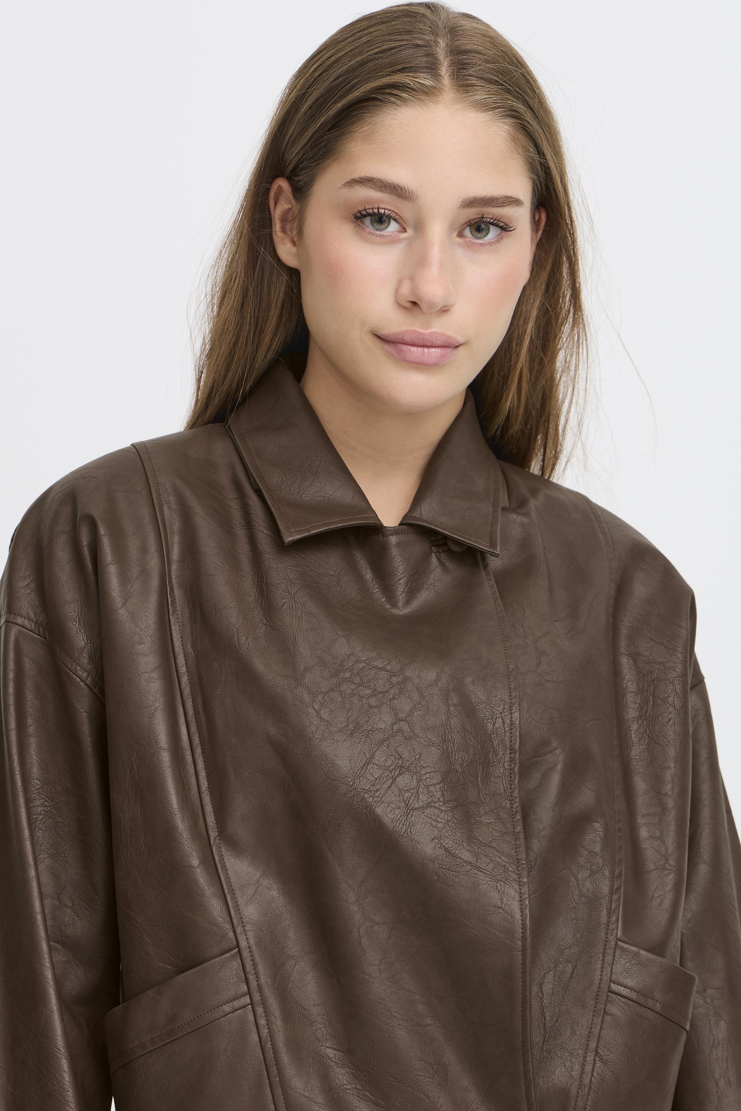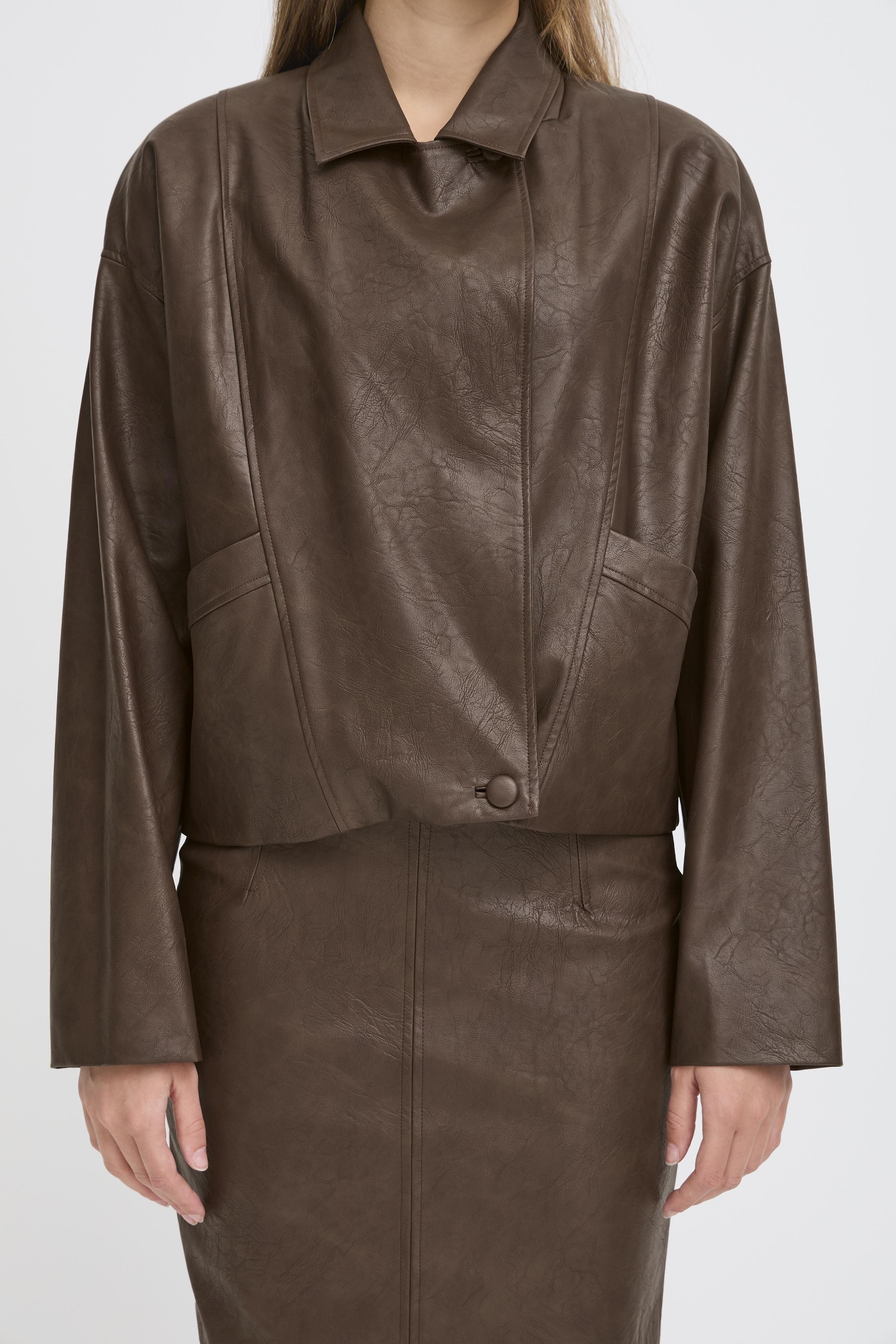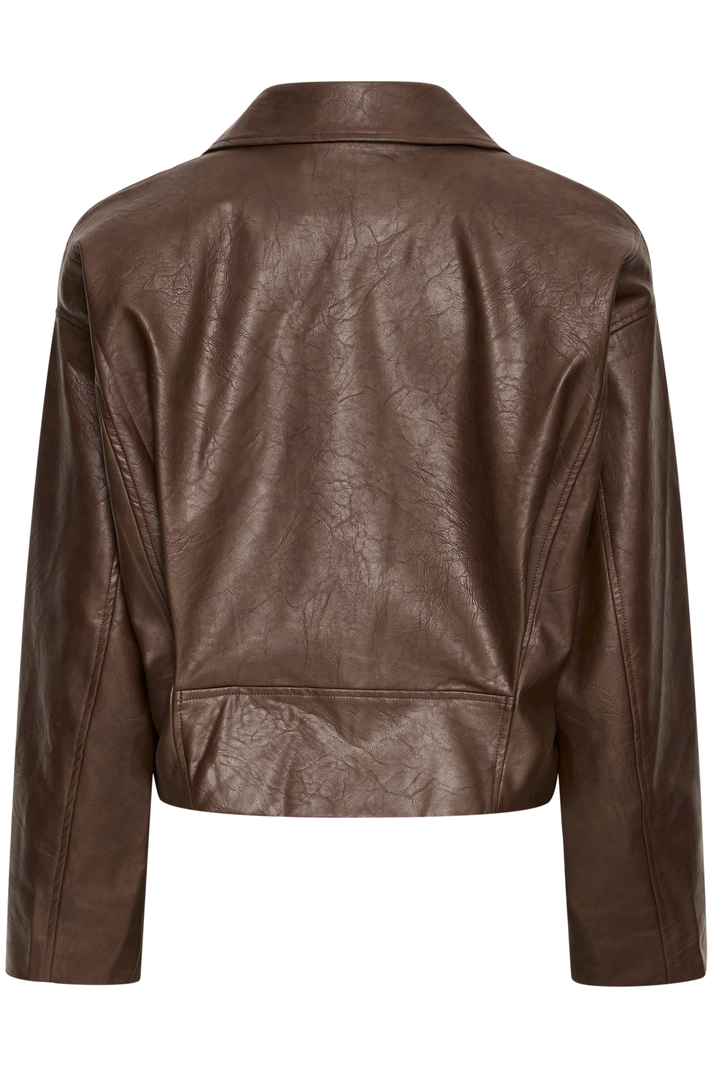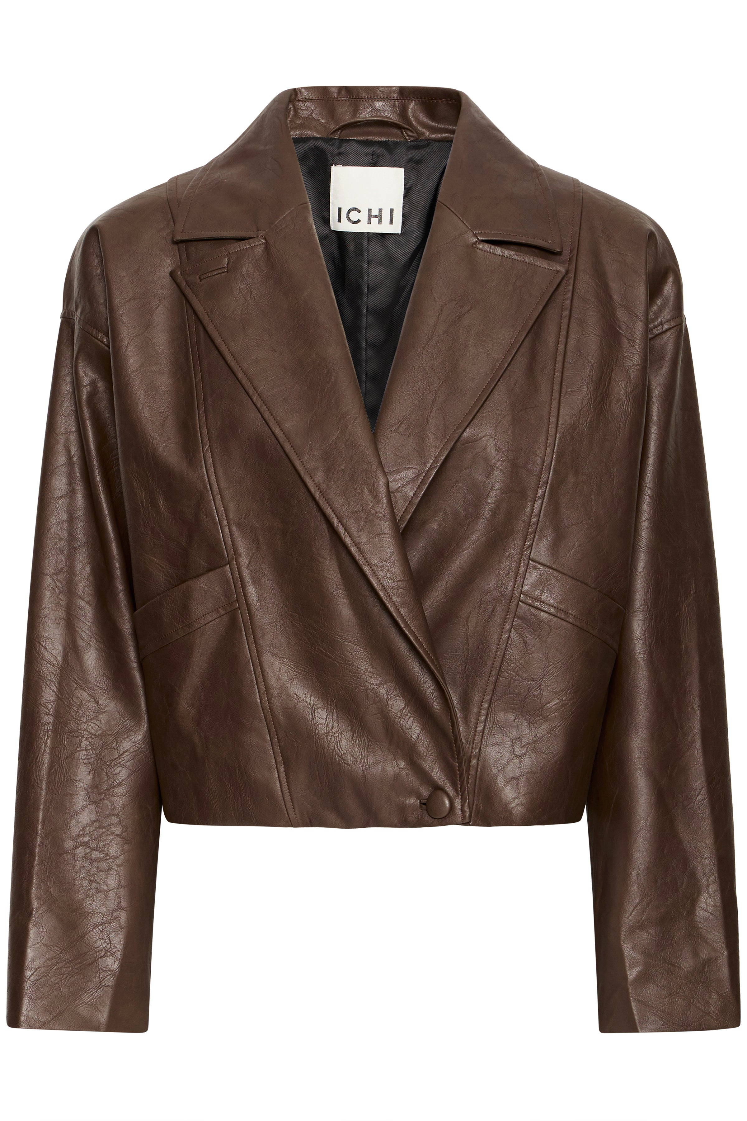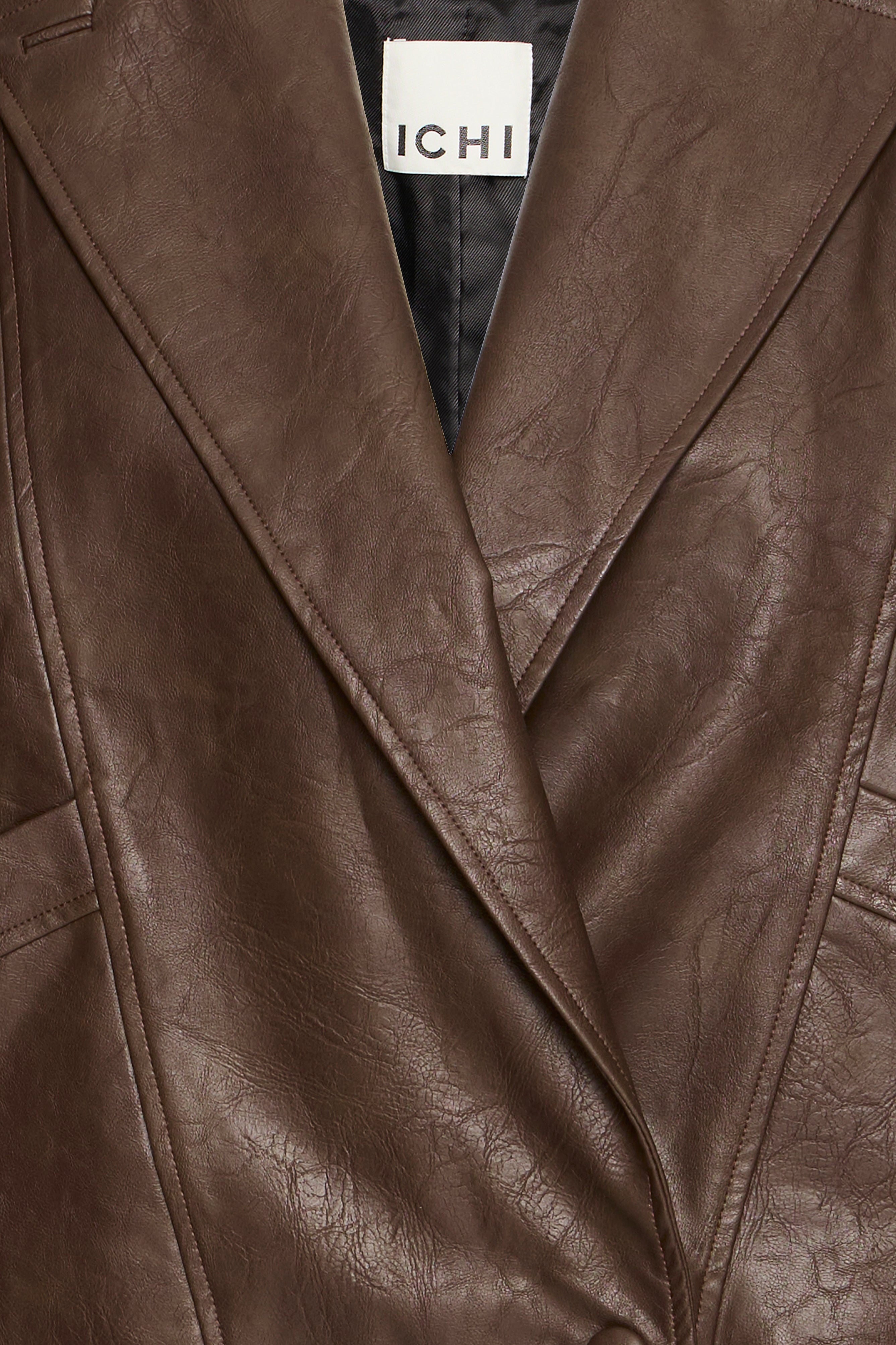 IHKILAVI jakke fra ICHI i kunstlæder har en afslappet pasform med cropped silhuet. Klassisk reverskrave, enkel knaplukning og lange ærmer for komfort.
